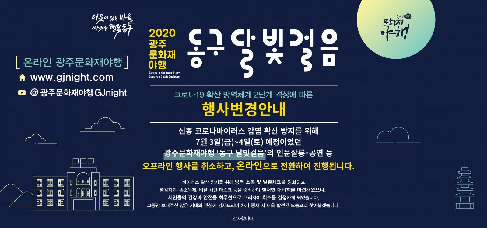 2020광주문화재야행 동구달빛걸음 오프라인행사 취소 및 온라인 행사 변경 안내 페이지 정보 작성자 관리자 작성일20-07-02 20:59 조회570회 이전글 다음글 목록 본문 - 이전글 다음글 목록
