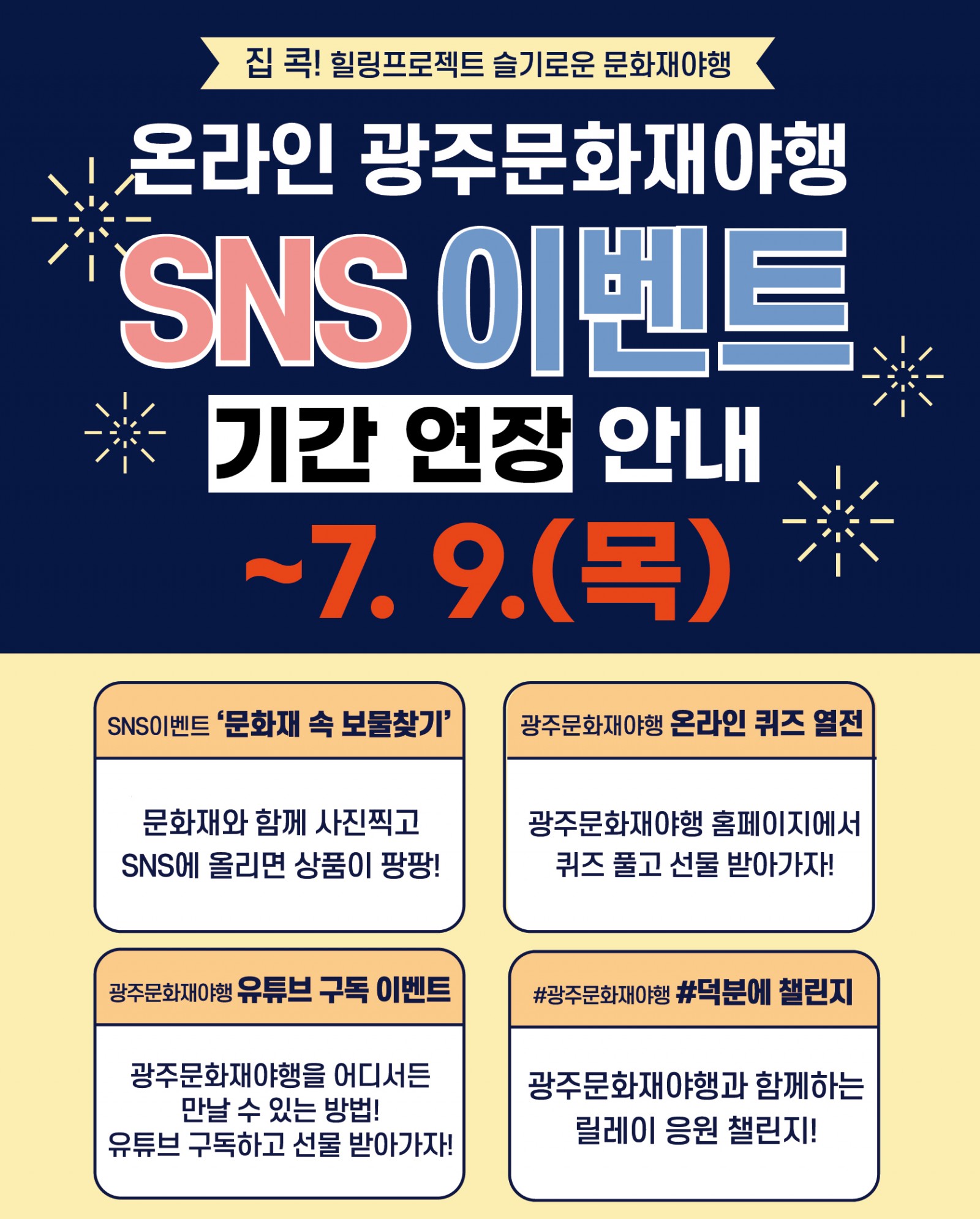 [SNS이벤트] 온라인 광주문화재야행 SNS이벤트 기간 연장 안내 페이지 정보 작성자 관리자 작성일20-07-07 11:08 조회985회 이전글 다음글 목록 본문 광주문화재야행 SNS 이벤트기간을 연장합니다. 놓치지 마시고 선물 받아가세요^^ *** 이벤트 당첨자 발표 : 7월 10일(금) 이전글 다음글 목록
